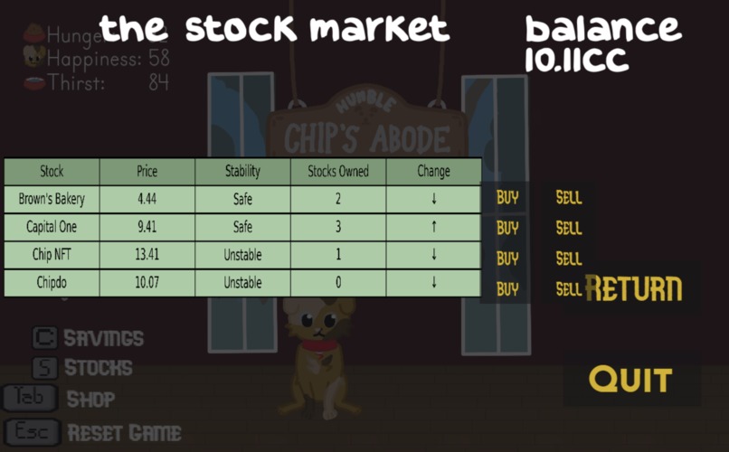 This is a small 2D game about taking care of your virtual dog, Chip, while learning about how you can earn money to do that - a game designed to teach children the importance of saving money. The shop introduces a level of challenge, as Chip must be fed and watered regularly, which encourages players to look for ways to earn money and spend it sensibly! Players can earn money through a savings account and through the stock system. However, if players aren't careful enough, Chip might die, which we thought was necessary to show the impact of money on learning audiences.